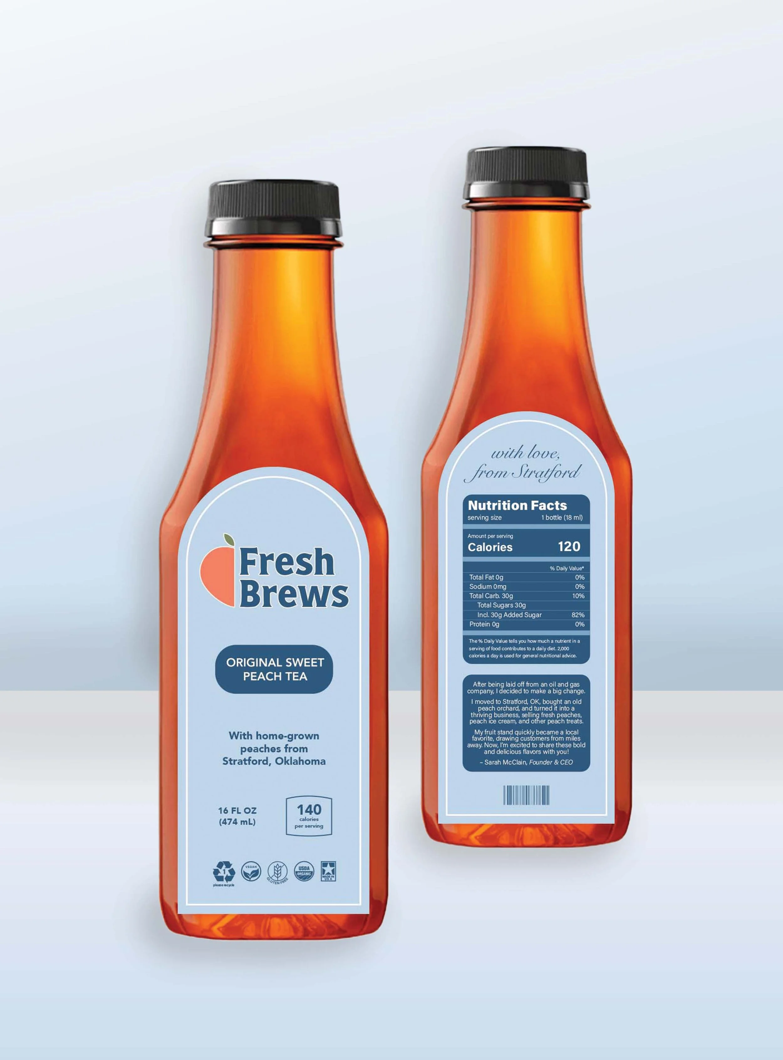 Package design for a fictional peach beverage company. Fresh Brews sweet tea is brewed with fresh peaches from Stratford, Oklahoma.