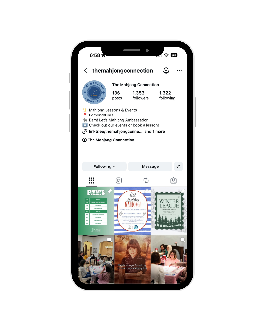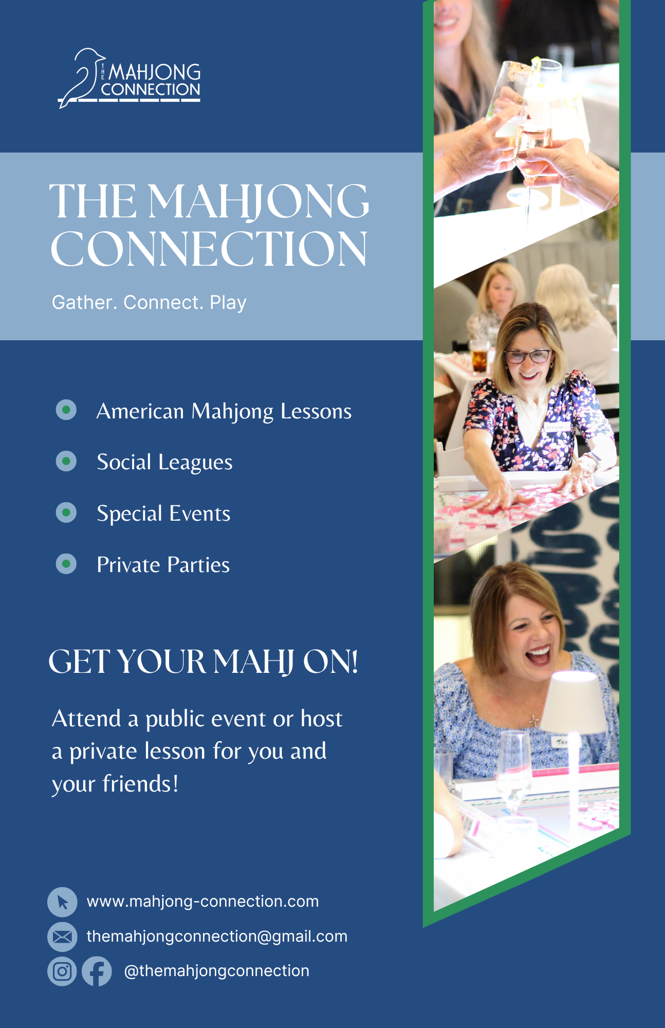 Through thoughtful posting and intentional design, I manage the Instagram account for The Mahjong Connection. Post about upcoming/past events and increase brand awareness. Create all content and increase engagement across Facebook and Instagram.
